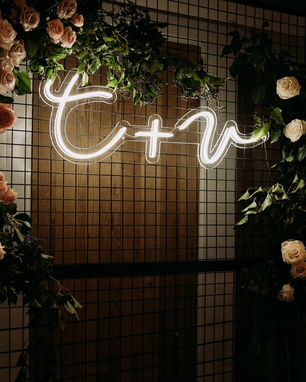 One of the most popular choices is to have your names, initials, or your new last name designed in neon. This timeless option adds a personal touch that can serve as both a decorative statement, a photo backdrop and a keepsake that will keep on shining. Your names glowing in warm white or blush pink LED neon as guests arrive instantly sets the tone for a magical evening.
